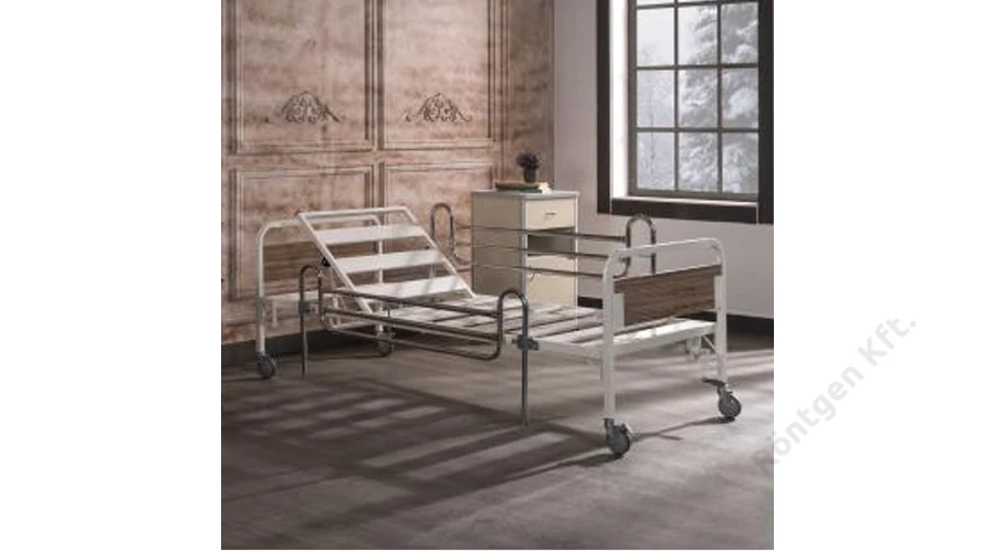 - A háttámla fogaskerék-rendszerrel működik, manuálisan állítható. - A fekvőfelület fém ágyrács. - A rögzített ágyvégek fa táblákból és fémcsőből készültek. - Az oldalrácsok króm-nikkel bevonatúak, kényelmesen le-fel hajthatók. - Infúzióállvánnyal ellátott, amely az ágy mindkét oldalára, a fejrészhez felszerelhető. - Négy 360 fokban forgó kerék, ebből kettő fékezhető. - Elektrosztatikus porfestéssel bevont fém alkatrészek. - Szélesség: 1000 mm - Hosszúság: 2100 mm - Magasság: 400 mm - Fekvőfelület: Szélesség: 900 mm, Hosszúság: 1900 mm