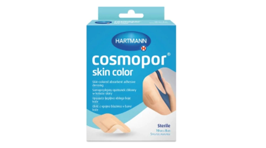 uTermékleírás: /u ul liA Cosmopor® Skin Color testszínű, lekerekített sarkú sebkötszer./li liEgyszer használatos/li liÖntapadó/li liRagasztóval bevont hátlapból (hordozóanyagból) és sebpárnából áll, melyen az öntapadó részt szilikonpapír védi/li liViselése kényelmes és diszkrét, véd az UV sugarak ellen (UPF 50+)/li liFelszívja a váladékot anélkül, hogy a sebhez tapadna/li liHátlap / hordozóanyag: bőrszínű poliuretán nem szőtt anyag./li liA félig áteresztő poliuretán anyag átengedi a vízpárát és a gázokat, védi a beteget a külső vírusok és baktériumok ellen/li liVízlepergető tulajdonsággal rendelkezik/li liA hipoallergén ragasztóréteg jó tapadást biztosít még a kúpos testrészeken is/li liBőrbarát módon eltávolítható: egy mozdulattal felragasztható, nem irritálja a bőrt, szakszerű eltávolításkor a bőrfelszín nem sérül/li liLatexmentes/li liPeremes védőfólia bevonata kesztyűben is biztonságosan eltávolítható/li liSteril, egyesével csomagolt/li /ul Alkalmazási terület Műtéti és kisebb akut sebek védelme és sebváladék felszívása (normál mennyiségű sebváladékot termelő sebekhez használható).