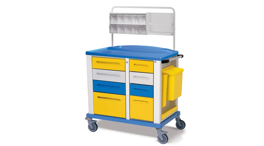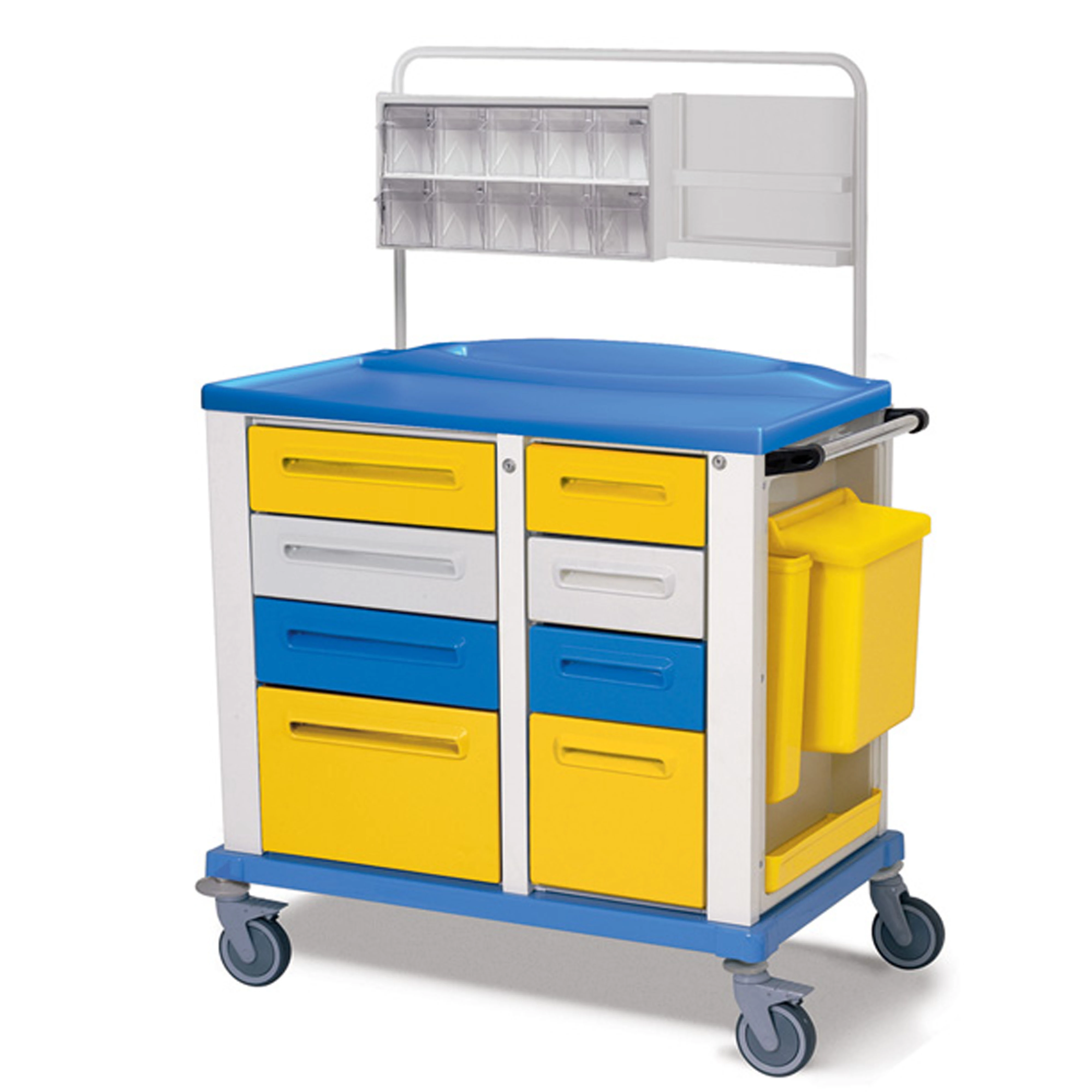 - Szín: sárga - Kocsi mérete (kiegészítők nélkül): 102 x 64 x m 100 cm - Fiókok száma: 8 Fiókok mérete: - 45 x 48 x m 13 cm (3) - 45 x 48 x m 27 cm (1) - 30 x 48 x m 13 cm (3) - 30 x 48 x m 27 cm (1) - Ezek a multifunkcionális professzionális kocsik festett acél szerkezettel és külső műanyag bevonattal rendelkeznek - 4, 8 vagy 9 fiókkal, egy oldalsó hulladéktartállyal (manuálisan nyitható, 15 l űrtartalmú) és egy extra oldalsó asztallal rendelkeznek. - Négy forgó gumikerék Ø 125 mm (2 fékkel) - Műszertartóval és felső adagolóval (10 billenő kosár) felszerelt