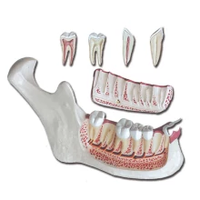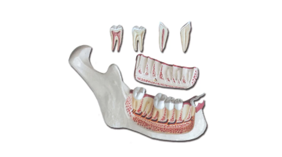 uTermékleírás:/u Ez a háromszoros nagyítású, hat részből álló anatómiai modell részletesen mutatja be egy felnőtt alsó állkapcsának (mandibulájának) szerkezetét. A modell egy része eltávolítható, így láthatóvá válik a foggyökerek és a csont belső felépítése. A szemfog (caninus) és az őrlőfogak (molárisok) kivehetők és hosszanti metszettel ábrázoltak, így jól megfigyelhetők a gyökerek, a pulpa és az idegek. Stabil talppal és állvánnyal szállítva, ideális oktatáshoz, bemutatókhoz és fogászati képzésekhez. strongFőbb jellemzők/strong - 3x nagyítású felnőtt mandibula modell - 6 részes, szétszedhető felépítés - Eltávolítható mandibuladarab a csont- és gyökeri struktúra bemutatásához - Kivehető, hosszmetszettel ábrázolt szemfog és őrlőfogak - Stabil talpas kivitel strongMűszaki adatok/strong - Méret: 35 × 18 × 31 cm - Súly: 1130 g