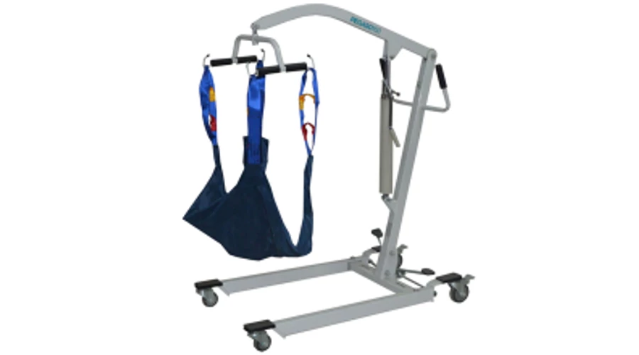 uTermékleírás: /u Hidraulikus betegemelő – max. teherbírás: 150 kg Acél szerkezetű, bevonattal ellátott hidraulikus emelő betegmozgatáshoz. Ideális az ágyból való kiemeléshez, áthelyezéshez, WC-re vagy kerekesszékbe ültetéshez. uJellemzők:/u - Első kerekek: Ø 7,5 cm – fékezés nélkül - Hátsó kerekek: Ø 10 cm – fékkel ellátva - Lábai pedállal nyithatók a nagyobb stabilitásért - Emelés hidraulikus nyomással vagy kézi vezérléssel állítható - Alaptartozék: heveder / hordozó hám (cikkszám: 43464) uMűszaki adatok:/u - Emelőkar hossza: 990 mm - Lábszerkezet hossza: 1190 mm - Teljes szélesség: 590 mm - Alap szélessége nyitott állapotban: 860 mm - Kampó magassága: állítható 950–1650 mm - Tolókar magassága: 1140 mm - Alap magassága a padlótól: 115 mm - Maximális teherbírás: 150 kg