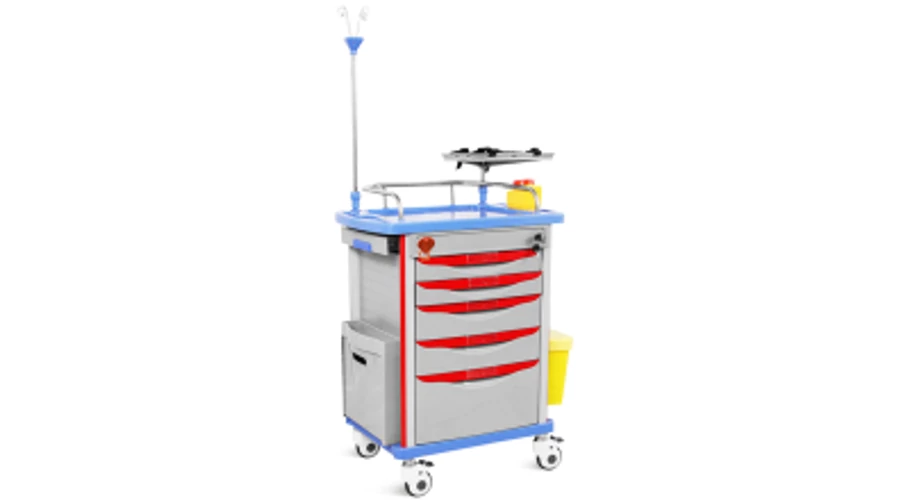 Termék jellemzői: -Strapabíró szerkezetű, öt fiókos vészhelyzeti kocsi -Négy görgő (Ø 10 cm) a függőleges oszlopvonalon a jobb stabilitás érdekében -Egy darabból álló munkalap teljesen védett fogantyúval a kényelem és a védelem érdekében -Méret: 75x47,5x92 cm -Súly tartozékokkal: 39 kg -Dupla zár + kulcs Standard tartozékok -Defibrillátor lemez -Infúziós állvány -Elhúzható oldalsó polc -Újraélesztési tábla -Hegyes tárgyak tárolására szolgáló tartály -2 hulladékgyűjtő -Oxigénpalack tartó -Elválasztók -Hálózati aljzat -Központi zár