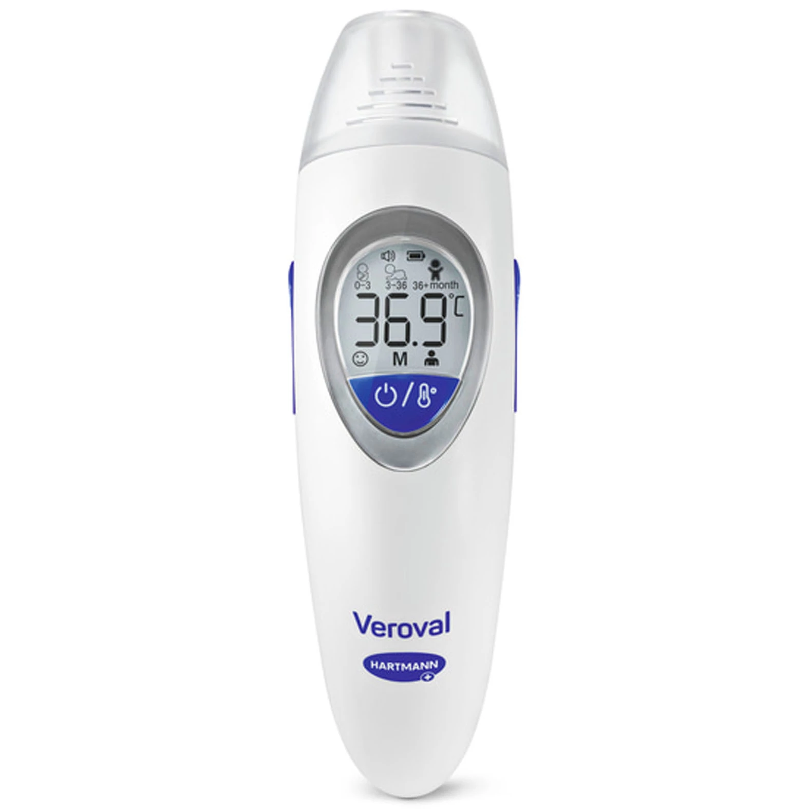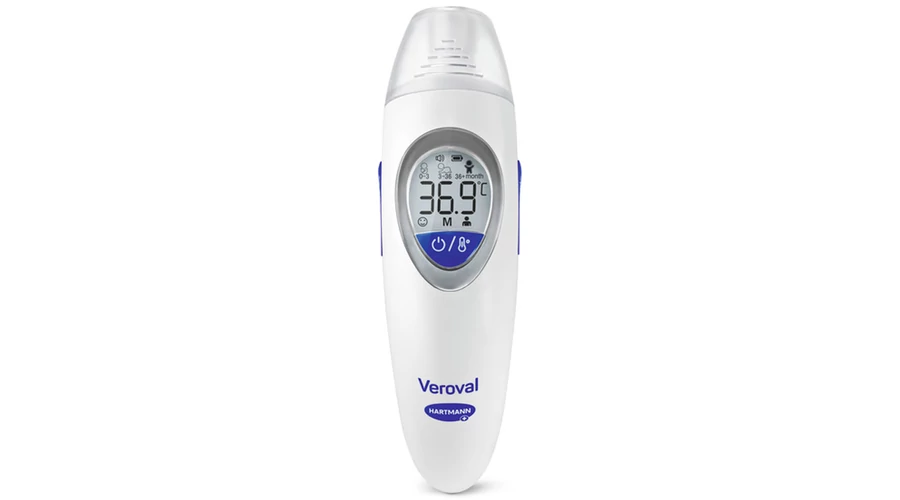 uTermékleírás: /u Veroval® family fül- és homlokhőmérő Egyszerű és kényelmes hőmérsékletmérés a fülben, a homlokon, valamint tárgyak és folyadékok felületén. uFőbb jellemzők/u - 3 az 1-ben funkció: Precíz hőmérsékletmérés a fülben, a homlokon, illetve tárgyak és folyadékok felületén – sokoldalú lázmérő az egész család számára. - Színes lázjelző: Válassza ki az életkori csoportot, és az eredmény életkornak megfelelő értelmezéssel, jól látható „közlekedési lámpa” színekben jelenik meg a kijelzőn. - Néma üzemmód: Diszkrét lázmérés zavaró hangjelzés nélkül. - Rezgő funkció néma módban: Hallássérült személyek számára is alkalmas. - Gyors mérés: Megbízható eredmény néhány másodperc alatt az infravörös technológiának köszönhetően. A csomag tartalma - Infravörös hőmérő - 2 × 1,5 V AAA elem - Tárolótáska - Használati útmutató